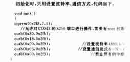 在使用这个方法的时候,必须对串口通信的硬件原理有一些了解。PC机的串口是由通用异步收发器8250UART(或16550)为核心构成的,寄存器基地址分别是0x3f8(COM1)和0x2f8(COM2),还有其他的一些用于控制的寄存器。有很多寄存器是与Modem相关的,而在使用三线制进行通信时用不到,只用关心与通信相关的寄存器,比起使用为通用功能编写的串口设备驱动程序来,直接读写相关寄存器效率更高。